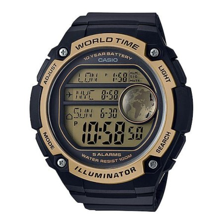 ساعت کاسیو مدل AE-3000W یک ساعت مچی دیجیتال مردانه اسپرت است که دارای ویژگیهایی مانند مقاومت در برابر آب تا ۱۰۰ متر، نمایش زمان سه شهر بهطور همزمان با امکان نمایش نقشه جهانی، کرنومتر با دقت ۱/۱۰۰ ثانیه، تایمر شمارش معکوس، ۵ آلارم روزانه، نور پسزمینه LED، و باتری با عمر ۱۰ ساله است [1، 3، 5]. بدنه و بند آن از جنس رزین است و صفحه نمایش دیجیتال دارد [2، 3].